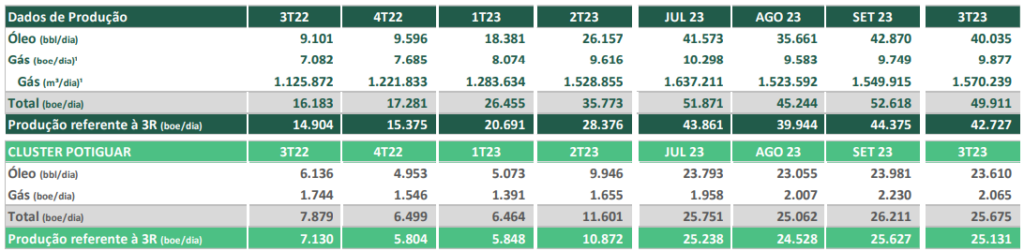 Em setembro, a produção total da companhia atingiu 52.618 barris de óleo equivalente por dia (boe/dia) ante 45.244 boe/dia do mês anterior e contra 51.871 boe/dia em julho. No terceiro trimestre (3TRI23), a petroleira registrou uma produção total de 49.911 boe/dia.