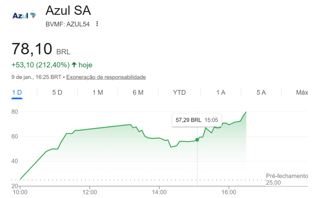 Os papéis AZUL54 sobem 216%, sendo vendidos a aproximadamente R$ 78. Ainda neste dia, as ações chegaram a ser negociadas abaixo de R$ 50 – nas negociações no começo do dia, dando este salto posteriormente.