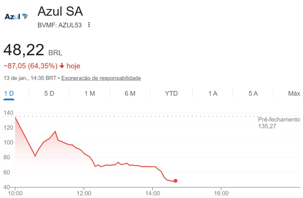 As ações da Azul (AZUL53) derretem mais de 64% nesta terça-feira (13), chegando a estarem sendo negociadas a aproximadamente R$ 48. Isso tudo ocorre porque a reestruturação da companhia ainda encontra dificuldades em decolar e o processo ainda está com o trem de pouso abaixado.