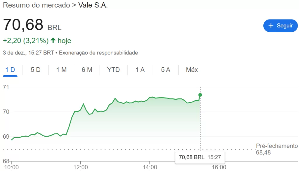 As ações da Vale (VALE3) sobem mais de 3% um dia após a conferência com investidores, o ValeDay, realizado em Londres, no Reino Unido, e também após a divulgação do guidance da companhia para o próximo ano. O banco BTG Pactual (BPAC11) vê a projeção amplamente em linha com as expectativas, reforçando um operacional mais simples, previsível e focada em retorno de caixa. Nesse cenário, o BTG reforça recomendação de compra, com preço-alvo de R$ 80.