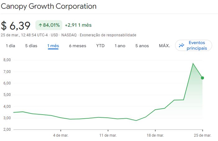 Ao término da sessão, as ações da Canopy Growth subiram 68,13%, atingindo US$ 7,69, registrando um aumento de mais de 100% na semana.