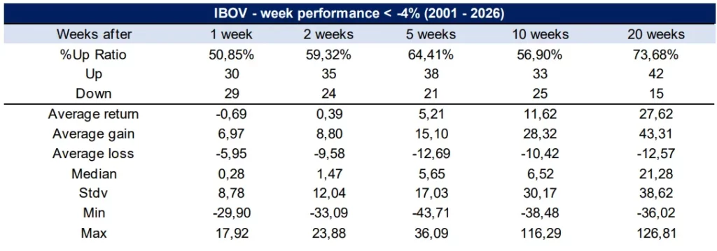 O levantamento identificou 59 episódios em que o Ibovespa registrou queda semanal superior a 4%. O padrão que emerge é claro: o curto prazo é incerto, mas o horizonte mais longo tende a ser construtivo.
