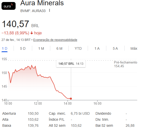 Como já havia sido antecipado por Bradesco BBI e Safra, o mercado reagiu negativamente aos resultados do quarto trimestre de 2025 da Aura Minerals (AURA33).
