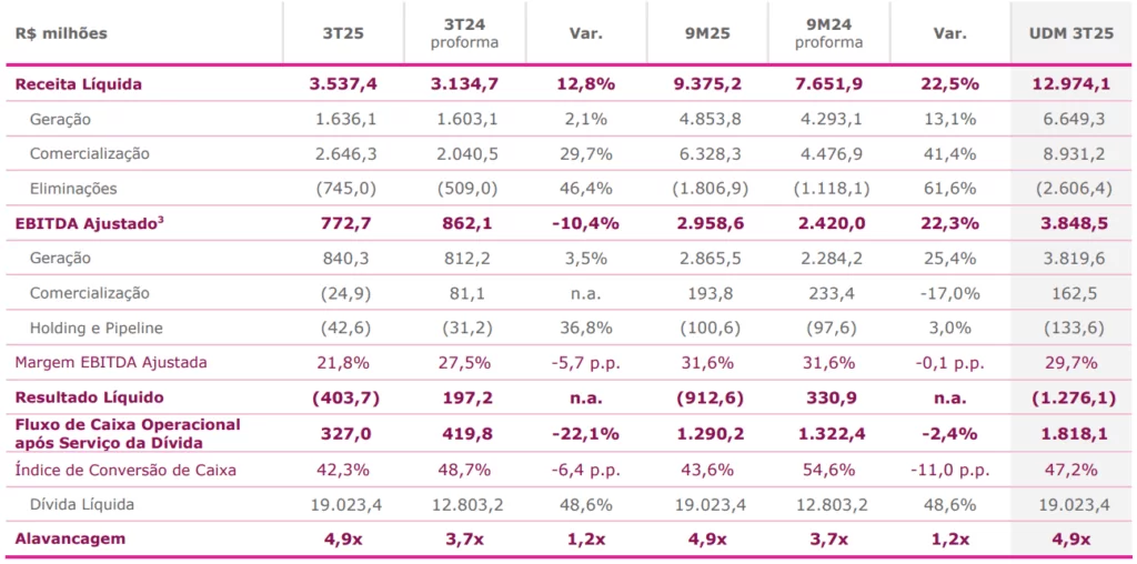 Enquanto isso, a empresa de energia informou, no 3TRI25, receita líquida de R$ 3,537 bilhões, ao passo que no mesmo período do ano passado, reportou R$ 3,134 bilhões, tendo um avanço de 12,8% nessa base de comparação.