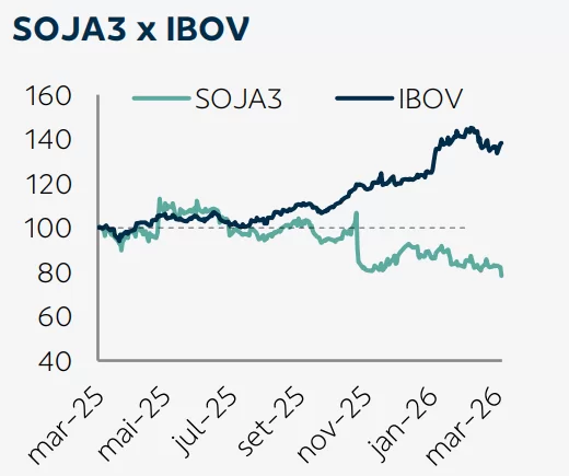 Relatório do BB Investimentos informa que as ações SOJA3 acumulam queda de 15% em 2026 até esta segunda-feira (24). Para a casa de análise, esse desempenho reflete a expectativa dos investidores em relação à piora da performance econômico-financeira da companhia, e que efetivamente se concretizou, com forte perda de rentabilidade em um ano marcado por desafios setoriais que a companhia não conseguiu contornar.