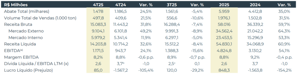 A receita líquida avançou 32,6% na comparação anual, mas ficou aquém das estimativas da casa, impactada por um desempenho mais fraco em algumas regiões e retração na Argentina. Na mesma linha, os volumes de abate e vendas também apresentaram queda na comparação trimestral, indicando uma desaceleração operacional no período.
