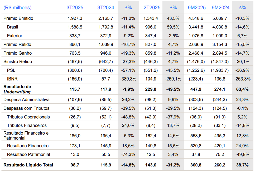 No topo da operação, o prêmio emitido totalizou R$ 1,93 bilhão, retração de 11% em relação ao 3TRI24. A queda foi mais intensa no segmento Brasil, que recuou 11,4%, enquanto o exterior caiu 9,2%. O prêmio retido acompanhou o movimento, diminuindo 16,7% na base anual, para R$ 866,1 milhões.