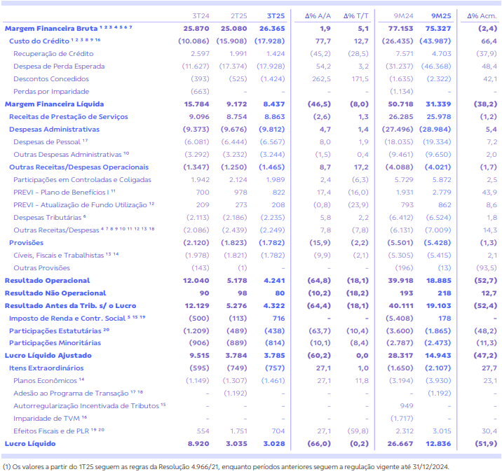 O Banco do Brasil (BBAS3) registrou uma redução de 66% no lucro líquido contábil no terceiro trimestre do ano (3TRI25) para R$ 3,028 bilhões ante lucro líquido de R$ 8,920 bilhões no mesmo período do ano passado.