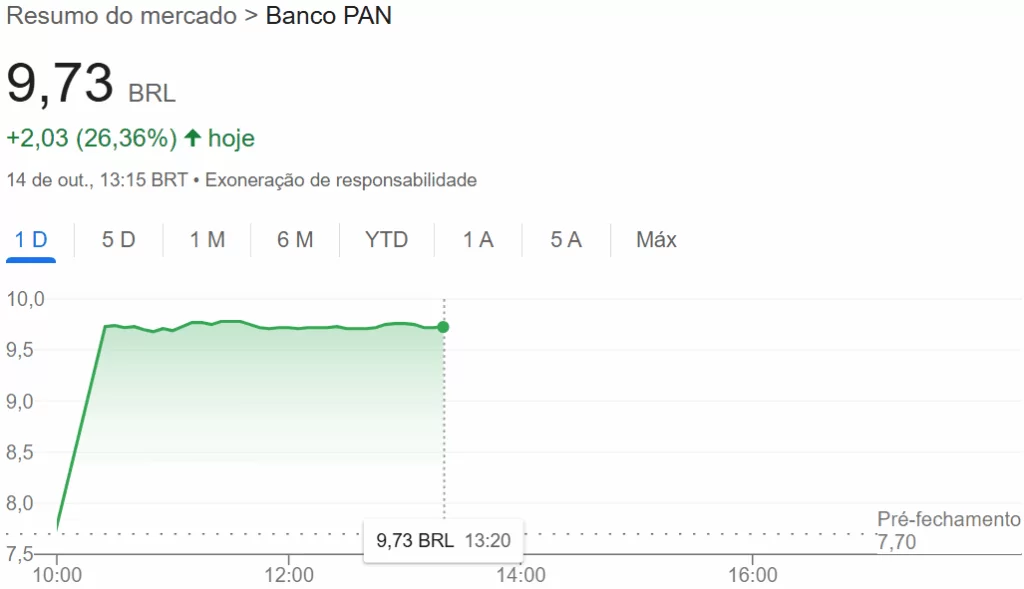 O Banco Pan (BPAN4) dispara 26,10% nesta terça-feira (14), com as ações preferenciais negociadas a R$ 9,71 no fim da manhã. O forte avanço ocorre após o anúncio da proposta de incorporação da instituição pelo seu controlador, o BTG Pactual (BPAC11).