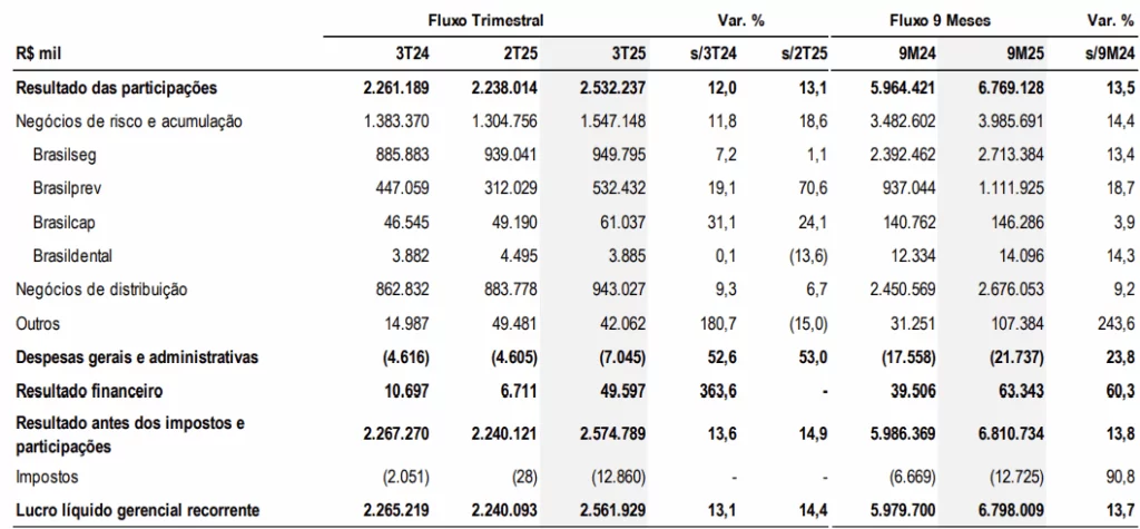Brasilseg: A seguradora, responsável pelos ramos de vida, habitacional, rural e patrimonial, registrou lucro líquido gerencial recorrente 7,2% superior ao do 3º trimestre de 2024. O crescimento foi apoiado por um avanço de 51,1% no resultado financeiro, reflexo direto da maior taxa média da Selic. O resultado operacional não decorrente de juros cresceu 2,9%, impulsionado por um aumento de 6,8% nos prêmios ganhos retidos — beneficiado pelo reconhecimento de receitas de vendas realizadas em períodos anteriores.