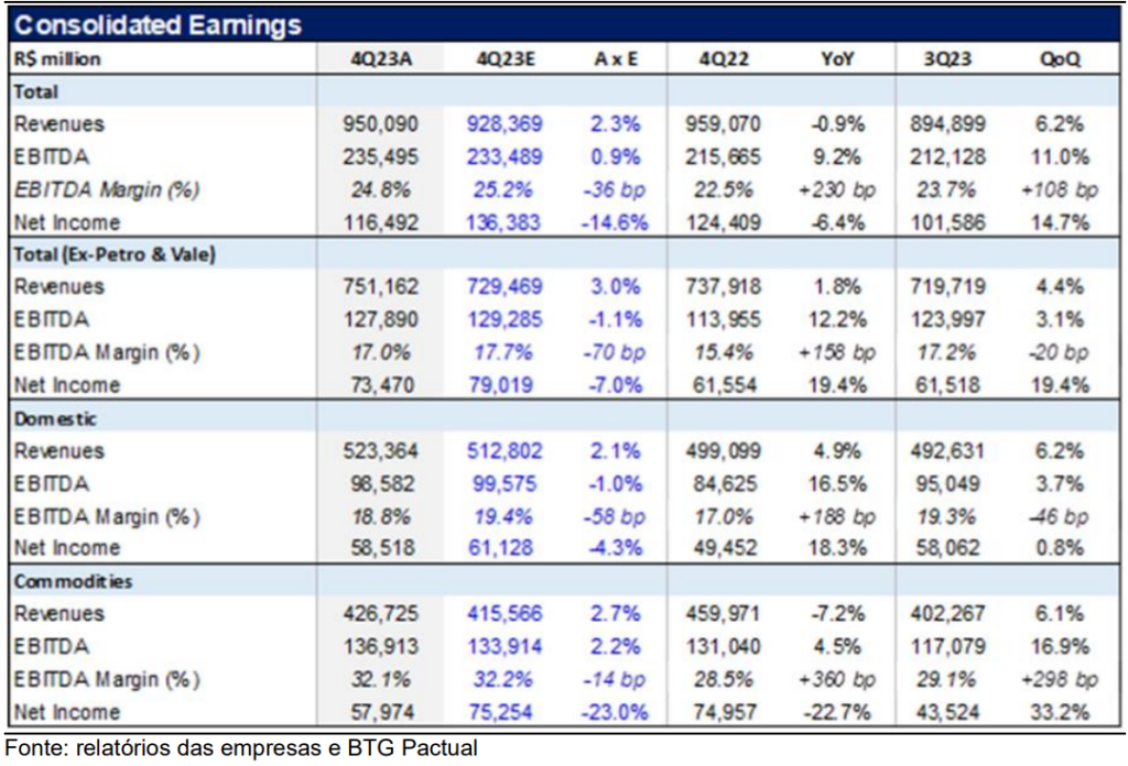 Porém, quando comparado os dados do 4TRI23 quando se compara com o 3TRI23, a receita, o EBITDA e o lucro líquido consolidados – também desconsiderando Petrobras e Vale – aumentaram 1,8%, 12,2% e 19,4%, respectivamente. “Olhando para os números das empresas domésticas, os resultados também foram fortes em relação ao 4TRI22, com receita, EBITDA e lucro líquido aumentando 4,9%, 16,5% e 18,3%”, avaliou o BTG.