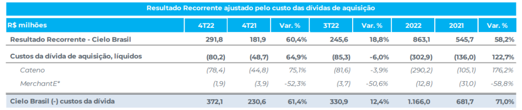 A Cielo (CIEL3) registro lucro liquido recorrente de R$ 291,8 milhões no quarto trimestre deste ano (4TRI22). O resultado é 60,4% maior frente ao mesmo período do ano anterior, quando havia sido de R$ 181,9 milhões.