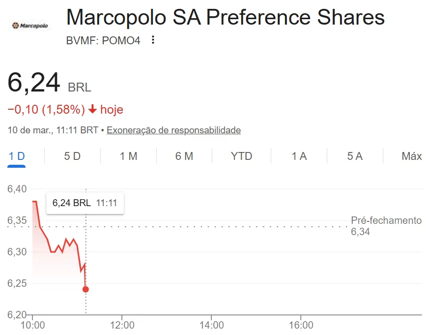 O banco Safra avaliou que os números trazem um impacto negativo para a fabricante de ônibus. Apesar disso, o relatório apontou que o ponto positivo do mês foi a resiliência das exportações, que cresceram 6,6% na comparação anual. No pregão desta terça-feira (10), as ações da empresa de ônibus caem 1,58%, a R$ 6,24.