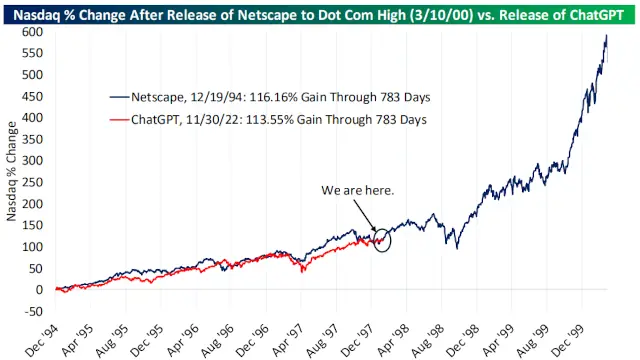 “A seguir, apresentamos uma análise atualizada da correlação quase perfeita entre a alta do Nasdaq após o lançamento da Netscape no final de 1994 e sua alta após o lançamento do ChatGPT em outubro de 2022”, aponta a consultoria Bespoke em um relatório enviado a clientes.