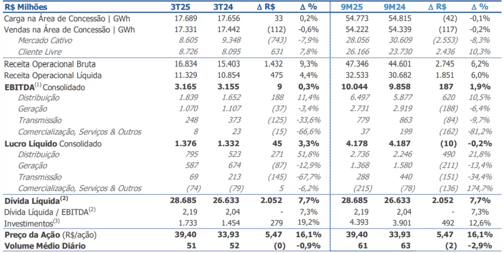 O EBITDA consolidado ficou em R$ 3,165 bilhões, praticamente estável na comparação anual, com leve alta de 0,3%. O segmento de distribuição novamente se destacou, com expansão de 11,4% no EBITDA, atingindo R$ 1,839 bilhão. Em contrapartida, geração recuou 3,4% e transmissão encolheu 33,6%.
