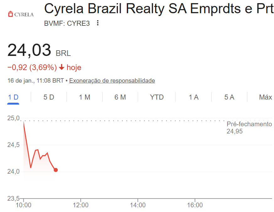 Em consequência, as ações da construtora recuam mais de 3%, a R$ 24, aproximadamente, sendo uma das companhias com queda mais intensa no Ibovespa. Entre as construtoras, ela só não cai mais do que a Direcional (DIRR3), que recua mais de 6%.