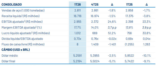 O volume de vendas de aço totalizou 2,811 milhões de toneladas, levemente abaixo das 2,858 milhões do 1TRI25 (-1,7%) e das 2,861 milhões do 4TRI25 (-1,8%). A alavancagem permanece controlada: a relação dívida líquida/EBITDA ajustado ficou em 0,74x, melhora frente às 0,76x do trimestre anterior e às 0,69x de um ano atrás.