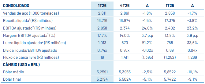 Na Metalúrgica Gerdau (GOAU4), os números praticamente espelham o consolidado do grupo. O lucro líquido ajustado foi de R$ 1,012 bilhão no 1TRI26, salto de 33,8% ante os R$ 756 milhões do mesmo período de 2025, e de 51,2% frente aos R$ 669 milhões do 4T25. O Ebitda ajustado chegou a R$ 2,955 bilhões, avanço de 23,3% na base anual, com margem de 17,7% — 3,9 pontos percentuais acima do registrado no 1TRI25.