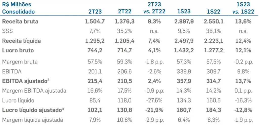 A receita líquida da companhia atingiu R$ 1,295 bilhão contra R$ 1,205 bilhão no 2TRI22, uma alta de 7,4%, ao passo que nos seis primeiros meses de 2023, a receita líquida atingiu R$ 2,497 bilhões contra R$ 2,223 bilhões dos seis primeiros meses do ano passado, uma alta de 12,4%.