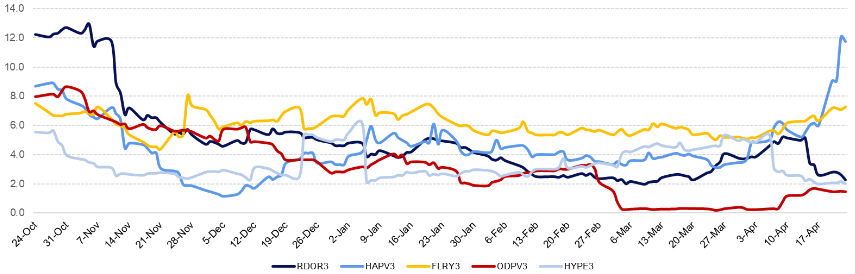 A taxa de aluguel da Hapvida disparou de apenas 1,1% ao ano em fevereiro para expressivos 79,7% em abril — o maior nível entre as empresas de saúde monitoradas pelo BTG.