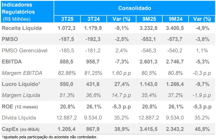 O EBITDA somou R$ 888,5 milhões no trimestre, queda de 7,3% em relação ao mesmo período de 2024. A margem EBITDA, entretanto, cresceu 1,6 ponto percentual, atingindo 82,9%, o que reflete a resiliência da operação em meio à redução de receita.