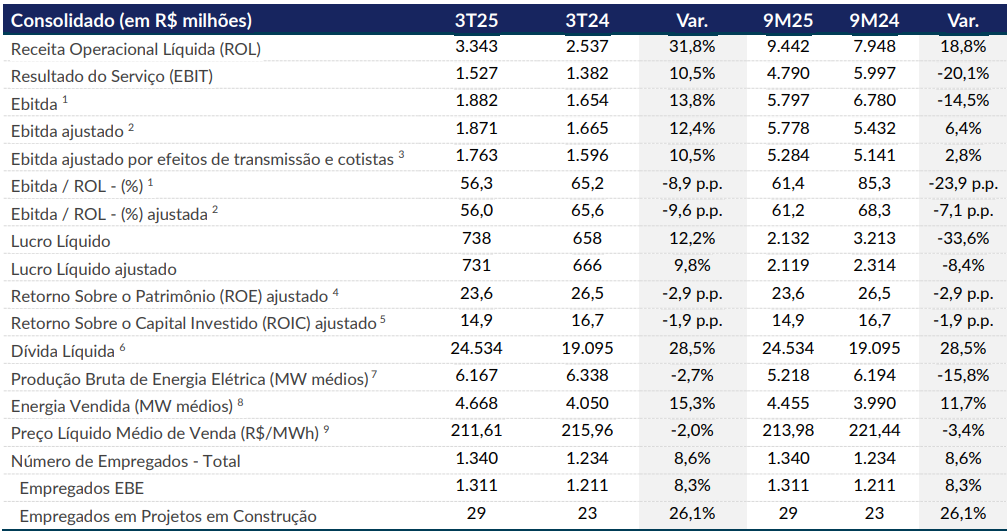Apesar da melhora trimestral, o acumulado de nove meses de 2025 mostrou retração nos lucros. O lucro líquido caiu 33,6% em relação ao mesmo período de 2024, totalizando R$ 2,13 bilhões. O Ebitda no acumulado recuou 14,5%, para R$ 5,8 bilhões, pressionado por menores volumes de geração e efeitos não recorrentes.