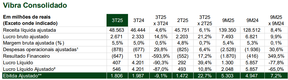 No acumulado dos nove primeiros meses do ano, a Vibra reportou lucro líquido de R$ 1,3 bilhão, recuo de 77,8% em relação ao mesmo período de 2024, enquanto o EBITDA ajustado somou R$ 5,3 bilhões, alta de 7,2%.