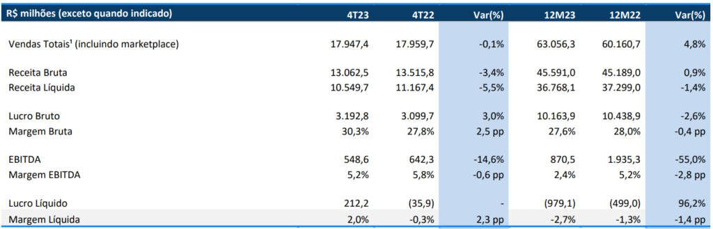 A receita líquida da rede varejista atingiu R$ 10,5 bilhões contra R$ 11,1 bilhões do quarto trimestre do ano anterior, registrando uma queda de 5,5%.