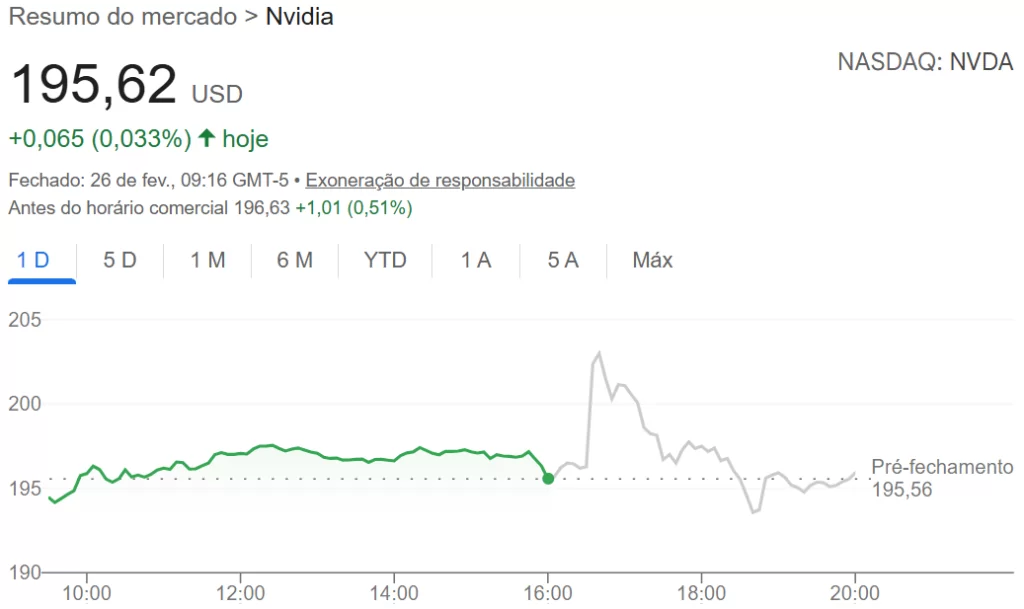 As ações da Nvidia (NVDA; NVDC34) prometiam ter um dia de elevação, ao operar em alta no pré-mercado na bolsa de Nova York, quando os papéis NVDA da companhia fabricante de chips eram negociados em elevação de 1,44%, sendo negociadas a US$ 195,62. Porém, logo após as 11h, pelo horário de Brasília, a ação zerou os ganhos.