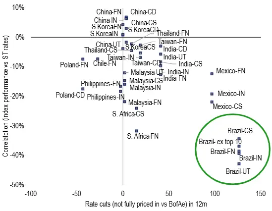 “Acreditamos que o Brasil seja um dos principais beneficiários, pois combina a maior correlação com taxas de juros mais baixas entre os mercados emergentes com cortes profundos nas taxas esperados (ainda não totalmente precificados) para os próximos meses”, reforça o banco.