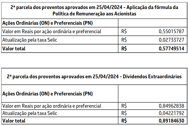Os dividendos foram calculados com base na fórmula estabelecida pela Política de Remuneração aos Acionistas da companhia. Para os dividendos regulares, a base para pagamento será a posição acionária de 25 de abril, enquanto os dividendos extraordinários serão pagos com base na posição acionária de 2 de maio.