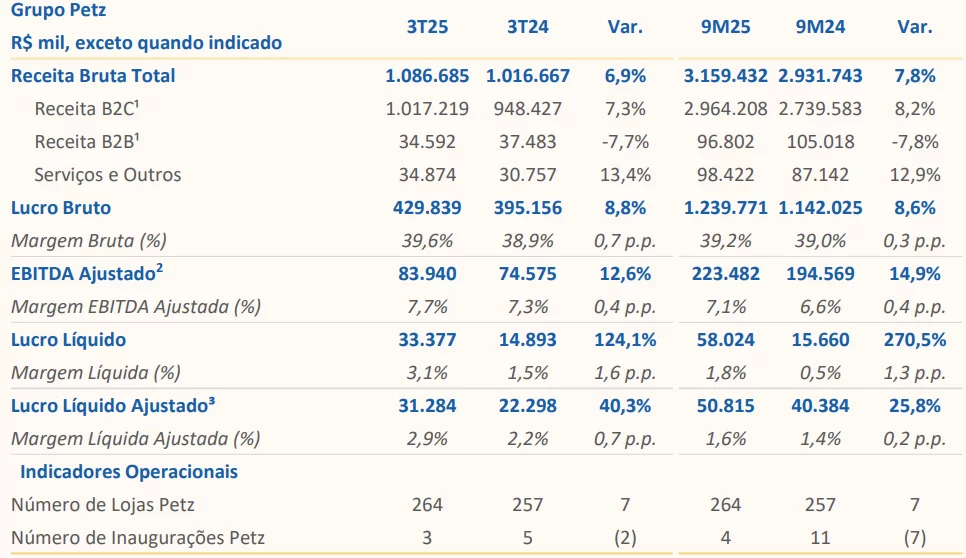 O lucro líquido da Petz (PETZ3) atingiu R$ 33,4 milhões no terceiro trimestre de 2025 (3TRI25), o que representa um salto de 124,1% em relação ao mesmo período de 2024, quando havia lucrado R$ 14,9 milhões. A margem líquida também cresceu 1,6 ponto percentual, alcançando 3,1%. No acumulado dos nove primeiros meses do ano, o lucro somou R$ 58 milhões, alta de 270,5% sobre igual intervalo do ano anterior.