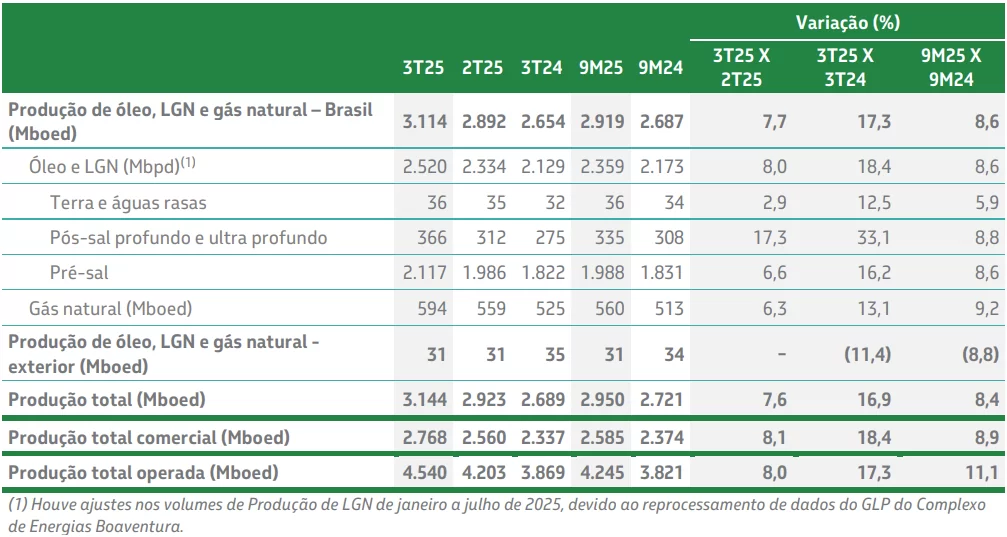 A produção da Petrobras (PETR4) registrou recordes no terceiro trimestre de 2025 (3TRI25), impulsionada pelo desempenho das plataformas do pré-sal e pelo avanço operacional de novos sistemas de produção. Segundo dados divulgados pela companhia, a produção média de óleo, LGN e gás natural alcançou 3,14 milhões de barris de óleo equivalente por dia (MMboed), um crescimento de 7,6% em relação ao trimestre anterior e de 16,9% na comparação anual.