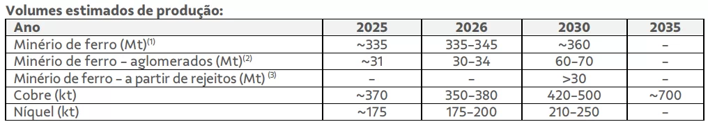 Para este ano, a companhia estima produzir aproximadamente 335 milhões de toneladas (Mt) de minério de ferro, volume que deve avançar para um intervalo entre 335 Mt e 345 Mt em 2026, chegando a cerca de 360 Mt em 2030. A produção de aglomerados, que está incluída no volume total de minério, deve ficar próxima de 31 Mt em 2025 e subir para 30–34 Mt no ano seguinte, alcançando entre 60 Mt e 70 Mt em 2030.