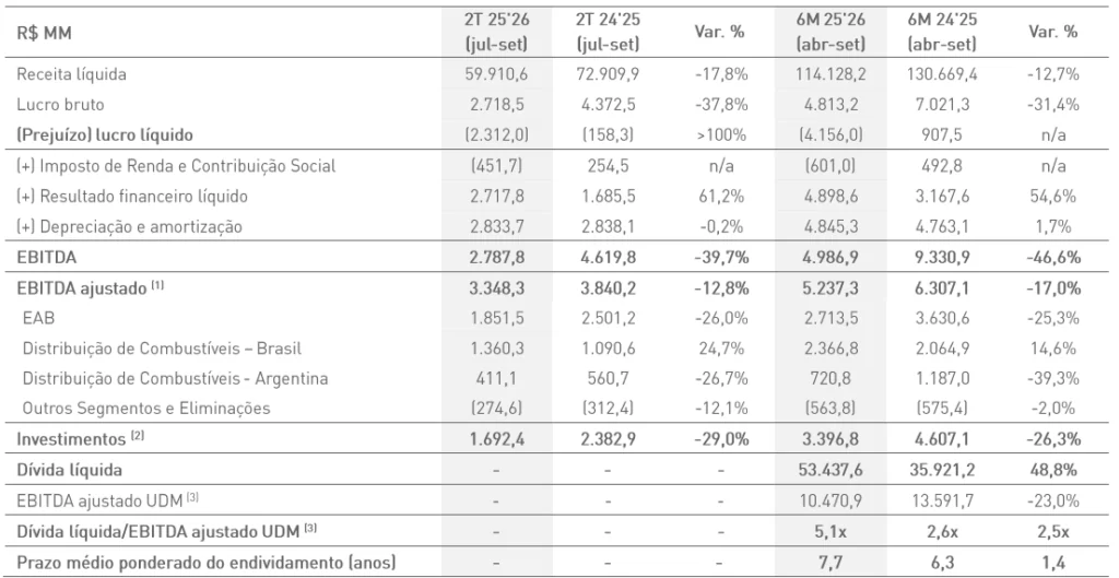 Já a receita líquida da empresa recuou 17,8% para R$ 59,910 bilhões ante R$ 72,909 bilhões do mesmo período do ano passado. No acumulado de 2025, houve recuo de 12,7%, saindo de R$ 130,6 bilhões para R$ 114,1 bilhões.