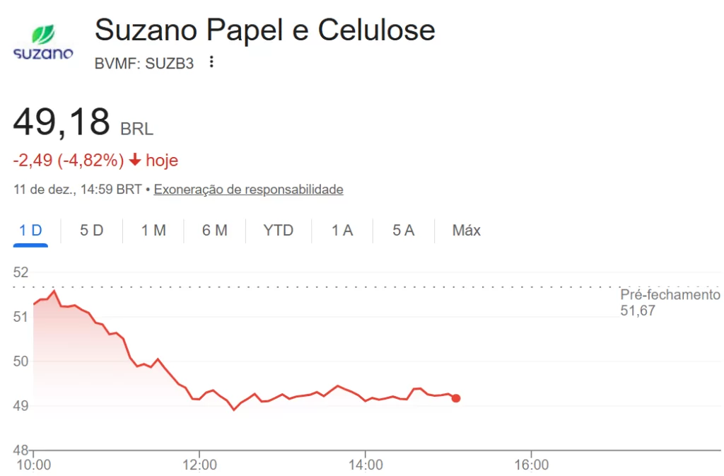 Na esteira da divulgação, as ações SUZB3 derretem quase 5%, a R$ 49,18. Isso faz com que os papéis da companhia acumulem baixa de 1,83%, no acumulado dos últimos cinco dias. De um ano para cá, a desvalorização do ativo passa de 20%.