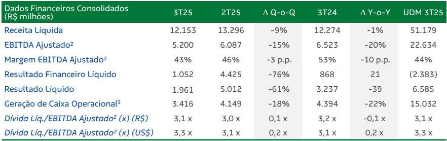 Na comparação anual, a retração de 39% no lucro foi explicada pelo aumento do CPV e do SG&A, além da leve queda na receita líquida. Esses efeitos foram parcialmente compensados por uma variação positiva no IR/CSLL, resultante do menor resultado operacional, e por um ganho financeiro derivado da desvalorização de 3% do dólar frente ao real, superior à de 2% registrada no 3TRI24.