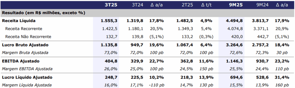 A receita líquida somou R$ 1,55 bilhão entre julho e setembro, avanço de 17,8% na base anual e de 4,9% frente ao trimestre anterior. A receita recorrente, principal fonte de faturamento da companhia, teve crescimento de 20,5% em um ano, totalizando R$ 1,42 bilhão, reflexo do aumento da base de clientes e da maior demanda por soluções digitais de gestão. Já a receita não recorrente somou R$ 132,7 milhões, uma leve queda de 5,1% em relação ao 3T24.