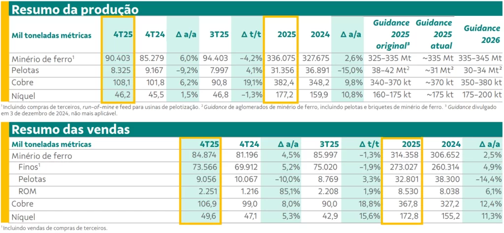Os números de produção do 4TRI25 apresentados pela Vale reforçam um forte ciclo de execução operacional em todas as frentes da companhia. A produção de minério de ferro alcançou 90,4 milhões de toneladas no trimestre (aumento de 6% em base anual e queda de 4% na comparação trimestral), levando o volume anual a 336 milhões de toneladas, acima do topo do guidance de 325 a 335 milhões de tonelada.