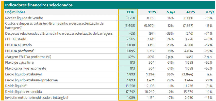 Por sua vez, o Ebitda ajustado atingiu US$ 3,830 bilhões contra US$ 3,115 bilhões dos três primeiros meses de 2025, resultando em uma variação positiva de 23%.