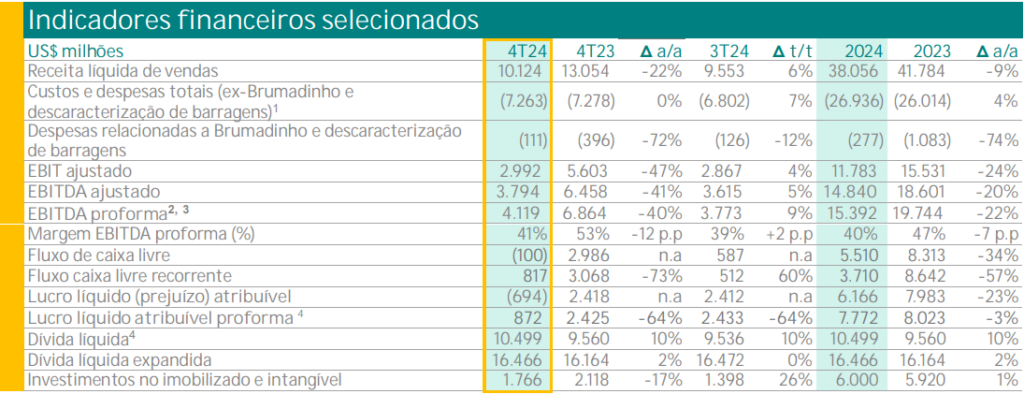 Em seu balanço, a mineradora registrou ebitda de US$ 4,119 bilhões do último trimestre do ano passado. Enquanto isso, no mesmo período do ano anterior, o ebitda havia sido de US$ 6,458 bilhões, tendo uma redução de 40%.