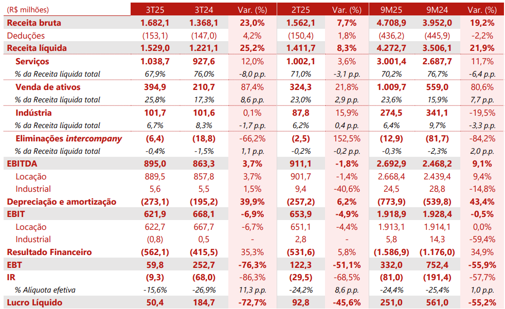 A receita líquida da companhia somou R$ 1,529 bilhão no trimestre, crescimento de 23% em relação ao 3TRI24, quando havia atingido R$ 1,368 bilhão. Já a receita líquida no acumulado do ano alcançou R$ 4,27 bilhões, alta de 21,9%, sustentada pelo crescimento da base de locação e pelo bom desempenho nas vendas de ativos.
