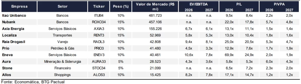 Além disso, o setor de serviços básicos segue como um dos mais relevantes, com o BTG mantendo sua exposição alterada em 20%, mas aumentando o peso das geradoras, substituindo a Equatorial (EQTL3) pela Axia (AXIA3), enquanto mantém a Eneva (ENEV3).