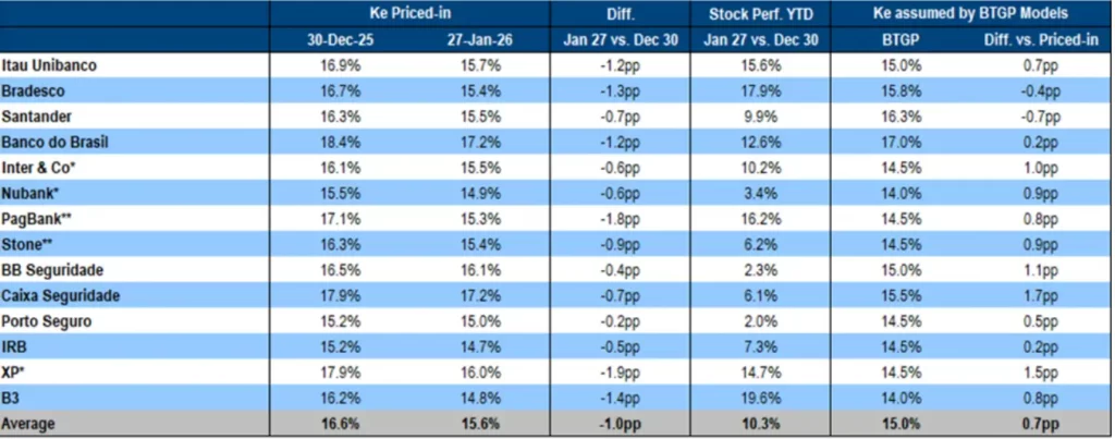“O Ke implícito para o nosso setor hoje é de 15,6%, contra 13,4% para o título local de 10 anos, o que implica um prêmio de risco de ações de 2,2% (contra 3,1% no final do ano)”, explicam.