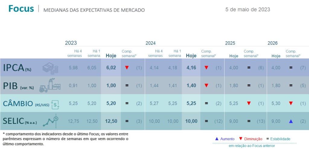 Para os demais anos, no entanto, ocorreram mais modificações nas projeções. Para 2024, foram revisadas para baixo as estimativas de inflação e do PIB. Já para o ano seguinte, a projeção do câmbio foi revisada para baixo.