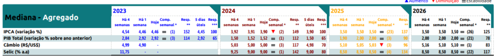 Já a Selic, taxa básica de juros, não teve suas projeções alteradas nesta edição do Boletim Focus. Vale lembrar, no dia 13 de dezembro, o Comitê de Política Monetária (Copom) decidiu promover o terceiro corte consecutivo de 50 pontos-base da Selic, que agora se encontra em 11,75%.