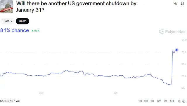 As chances de um novo “shutdown” no governo federal dos EUA no próximo sábado (31) saltaram de aproximadamente 10% na sexta-feira para próximos a 80% nesta segunda-feira, mostra o site de projeções Polymarket.