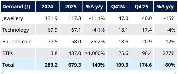 No relatório oficial, a consultoria destaca que “a demanda por ouro nos EUA subiu 140% ano a ano para 679t em 2025” e que o movimento foi “impulsionado quase inteiramente pelo investimento em ETFs”.