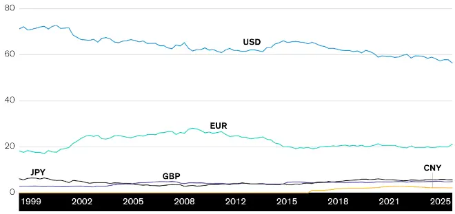 A avaliação vem em um momento em que fatores estruturais já pressionam a moeda norte‑americana. Winograd lembra que o dólar segue caro em termos de taxa de câmbio efetiva real e que a participação do dólar nas reservas globais – ainda perto de 60% – cai gradualmente ao longo do tempo.
