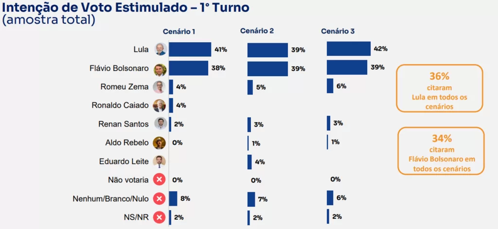 No primeiro cenário, com Ronaldo Caiado (PSD) na disputa, Lula surge com 41% das intenções de voto contra 38% de Bolsonaro, ao passo que Romeu Zema (Novo) surge bem atrás, em terceiro, com 4%.